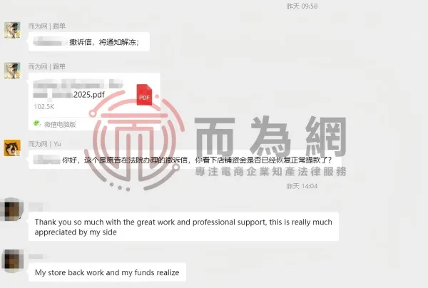 客户起初非常焦虑,但在与我们团队沟通的过程中,逐渐建立了信任。仅用一晚时间,客户便决定委托我们全面处理此案。而为网迅速指导客户完成店铺资料的整理与提交,并即刻启动案件处理流程。