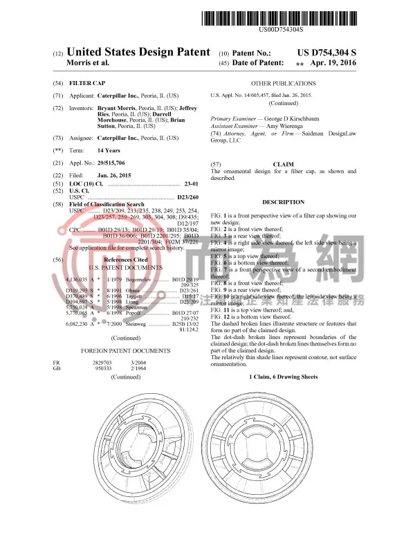 本案涉及一项外观专利,申请日期为2015年1月26日,下证时间为2016年4月19日。未经授权同款CAT 发动机滤芯帽不能售卖,否则会有侵权风险!