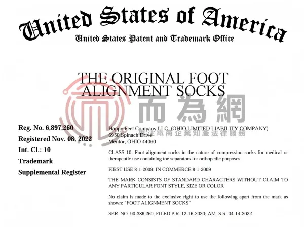 本案涉及的商标信息如下,主要注册在第10类:用于医疗或治疗用途的压缩袜,具有足部对齐功能。未经授权以下文字商标均不能擅自使用,否则会有侵权风险!
