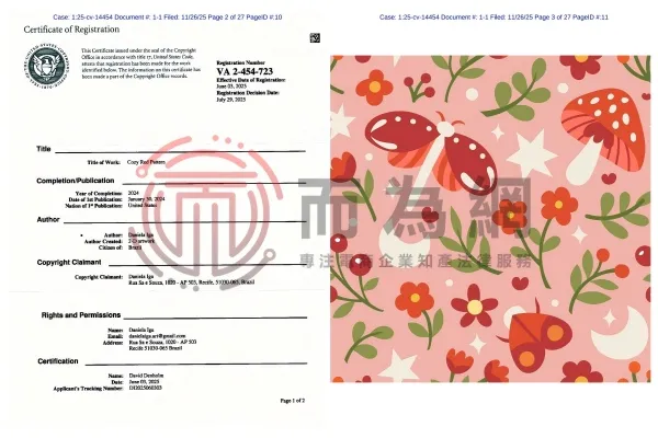 原告Daniela Iga是一位来自巴西的插画师与图案设计师,以花卉植物和极简几何为创作核心。她的创作灵感来源于自然与鲜艳色彩,擅长用矢量插画呈现清新可爱的艺术作品,她常用Procreate绘制草图,并以Adobe Illustrator完成精准的矢量设计,同时也通过Photoshop或Procreate创作富有纹理感的插画作品。