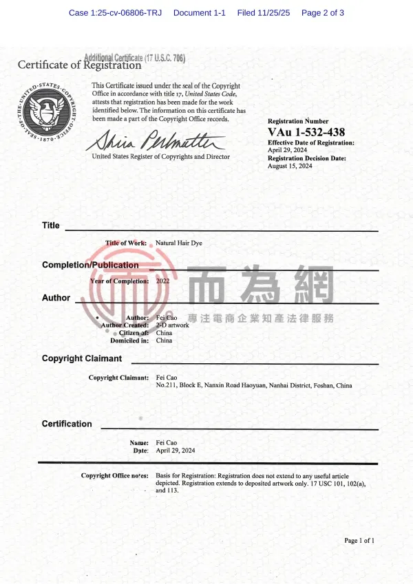 25-cv-6806、25-cv-7113 速看速排查下架!国人原告Natural Hair Dye 染发剂版权连发两案,已有251家沃尔玛店铺中招!