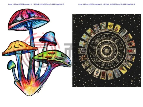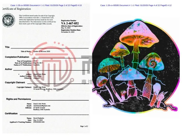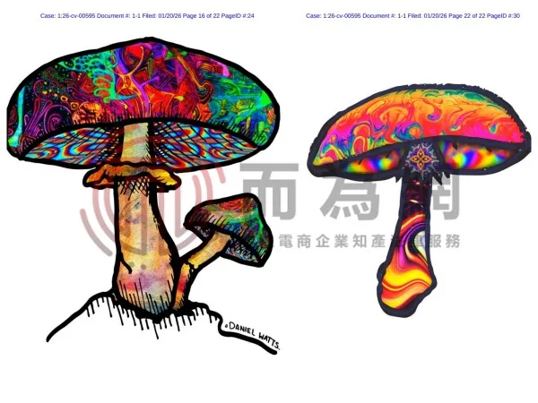 26-cv-595 Keitn代理7张全新版权发案!涉及七彩蘑菇、神秘花纹等元素!
