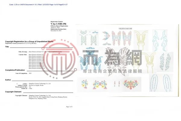 原告Hangzhou Yuanzu Technology Co., Ltd是一家中国企业,专注于将原创艺术与潮流产品相融合。本文两案涉及的三组靴子花卉图案是原告在2023年创作完成的专为时尚靴类设计的作品。