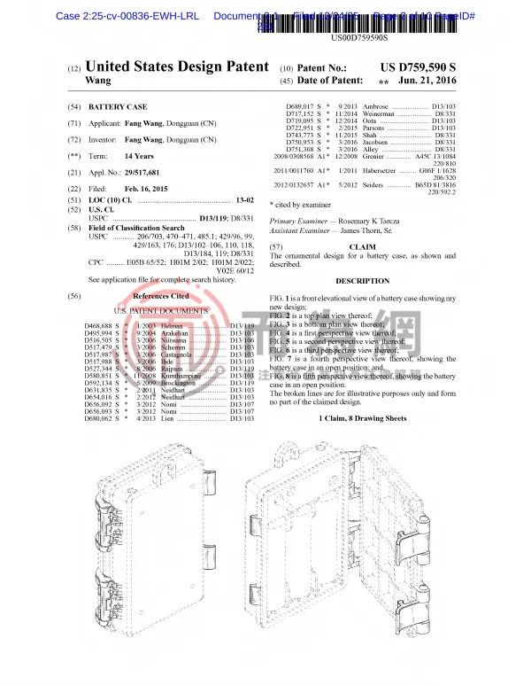 25-cv-836 国人案件+1!一款电池盒外观专利正在维权,速排查下架!