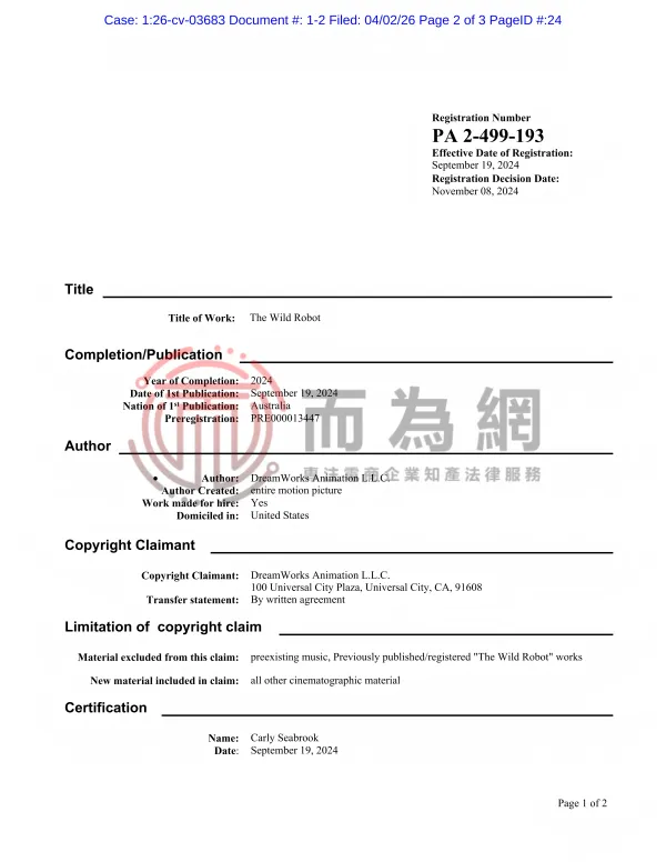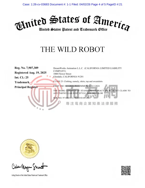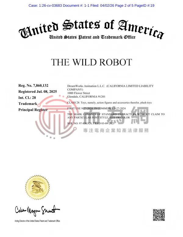 26-cv-3683 GBC 律所代理The Wild Robot 荒野机器人发起商标+版权双维权!相关周边产品立刻下架!