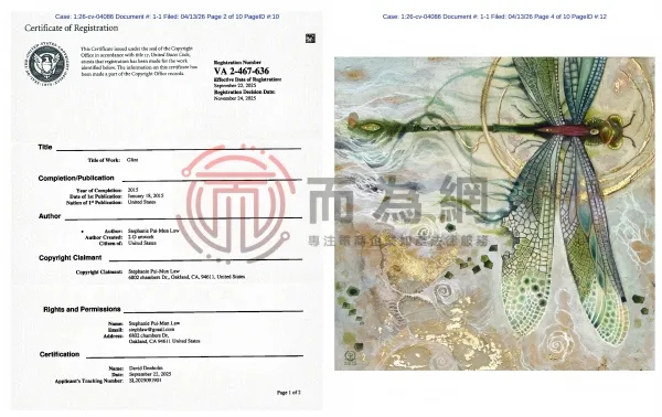 26-cv-4086 Stephanie Pui-Mun Law 3张蜻蜓水彩版权发案!103家店铺中招!